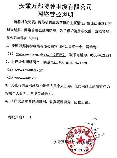 鄭重聲明:安徽萬邦特種電纜有限公司官方網站為:www_wanbangcable_com.jq81186.cn,除此之外無任何子網站或合作網站,其余均為假冒偽劣。電話:0550-7621728 13485756353 地 址:安徽省天長市滁州高新技術產業開發區經四路29號
